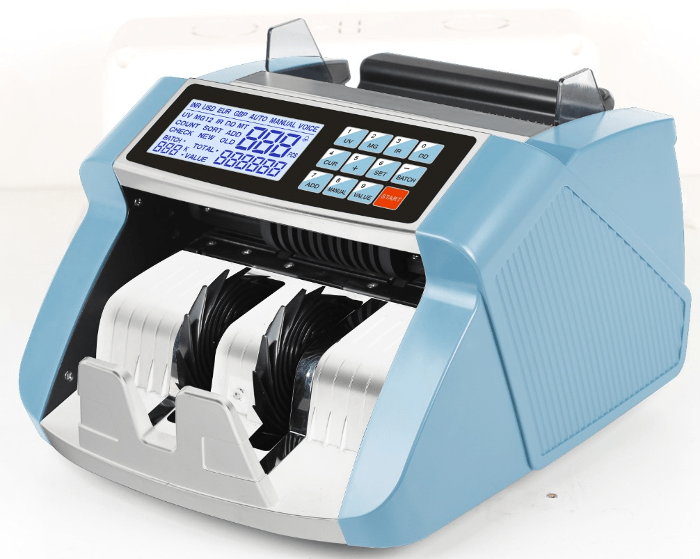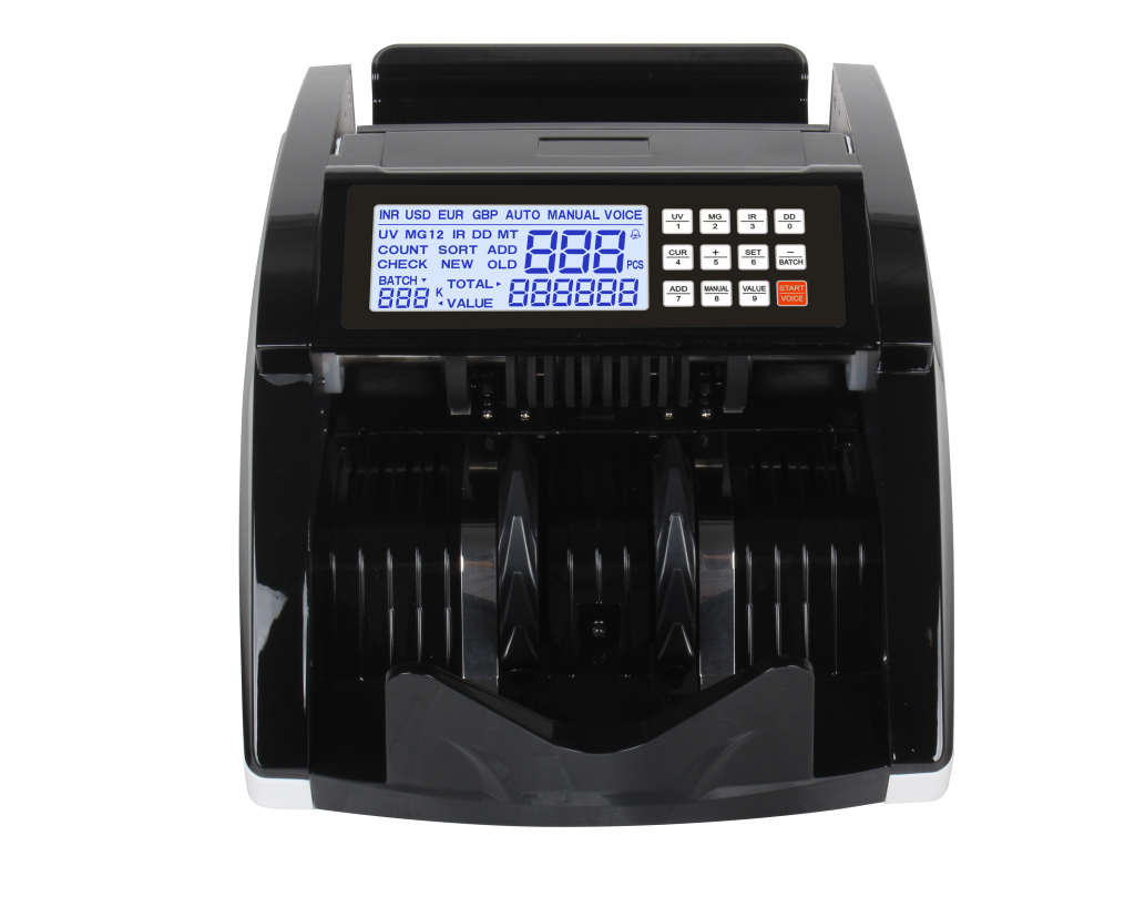 High-performance cash counting machine designed for efficient and accurate currency handling. Features advanced Counterfeit Detection System (UV, MG, IR sensors) and supports all Indian denominations including new notes.