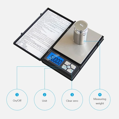 A sleek notebook-style high precision digital scale with a 500g capacity and 0.01g readability. The protective cover folds out to mimic a small notebook, revealing a wide stainless steel platform and a clear blue backlit LCD display.