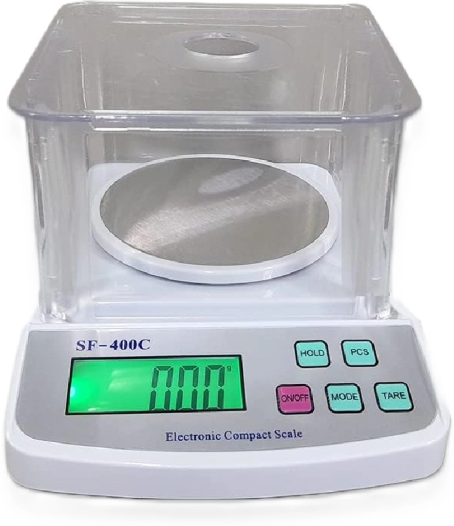 High precision mini digital weighing scale with a 600g capacity and 0.01g accuracy. Features a clear protective cover, round stainless steel pan, and crisp LCD display. Ideal for jewellery, laboratories, and research.