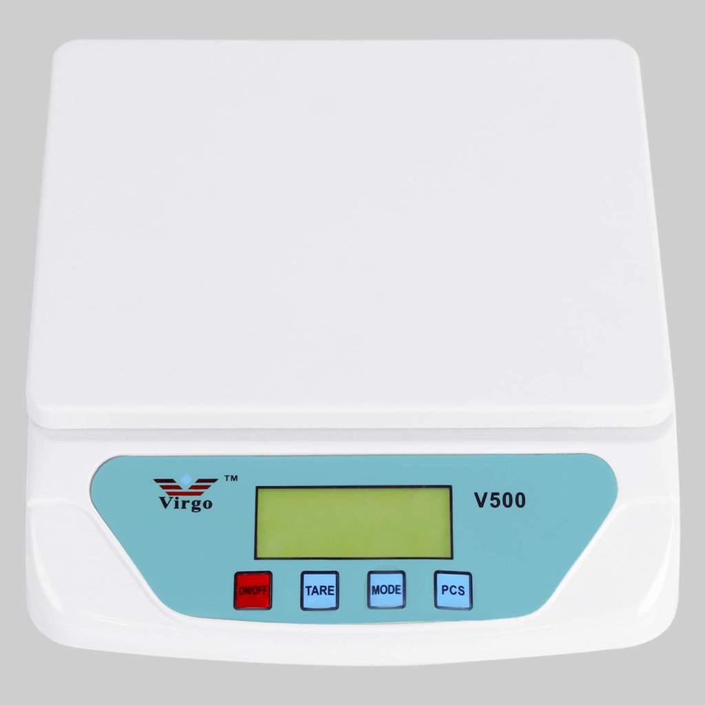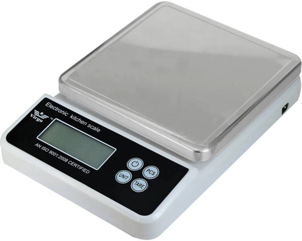 A durable and versatile digital kitchen scale by Virgo. Features a wide, flat weighing surface, easy-to-read LCD display, and simple 3-button operation (ON/OFF, TARE, MODE). Designed for accurate everyday household and kitchen measurements.